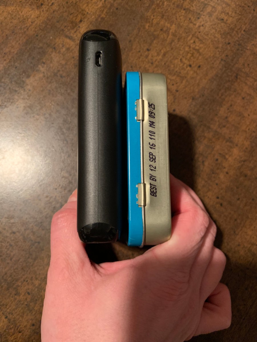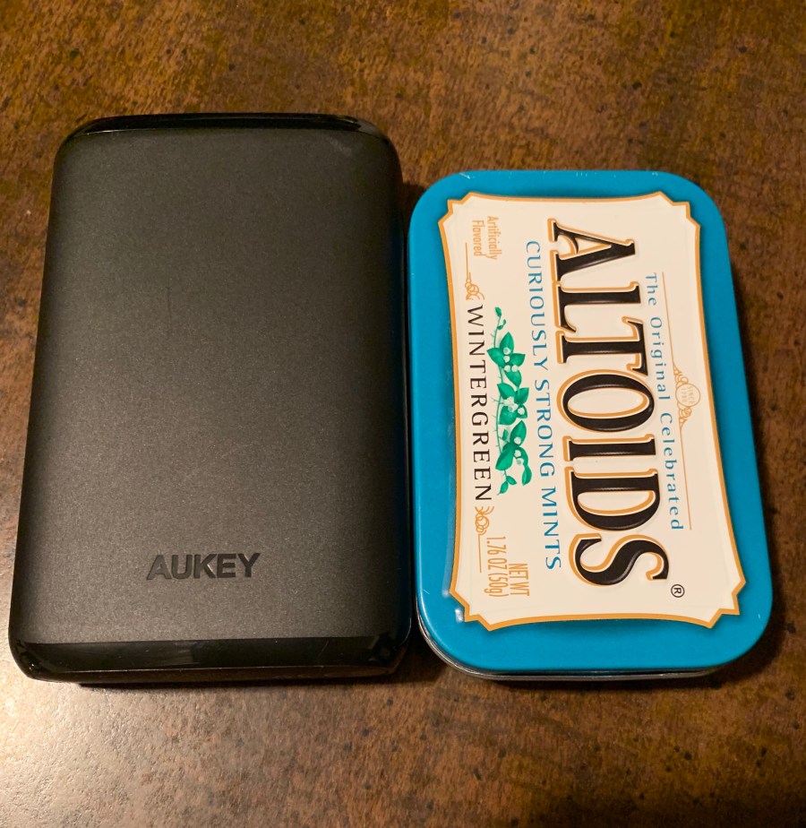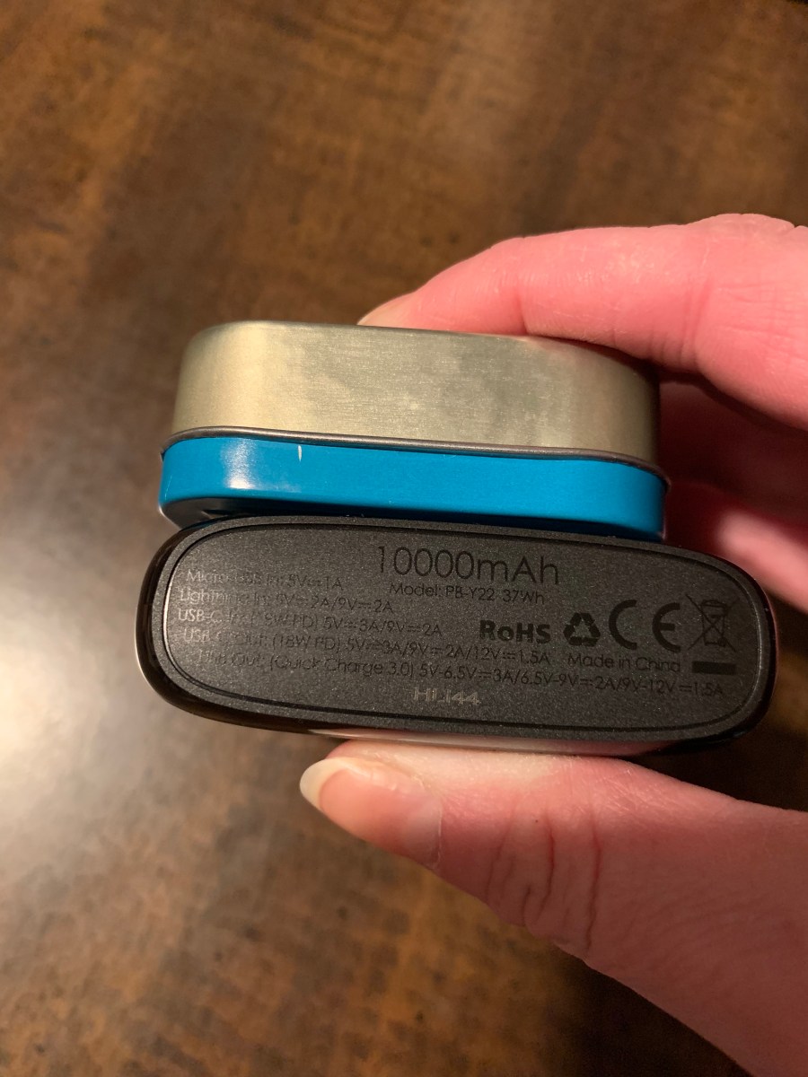 I figured that a power bank might be more helpful because they are smaller, usually lightweight, easy to hold while charging your device while you are using it(or it can be set on the table/desk next to you), and convenient to carry in a purse, pocket, or backpack! The Power bank is about the size of an altoid tin as you can see pictured below.